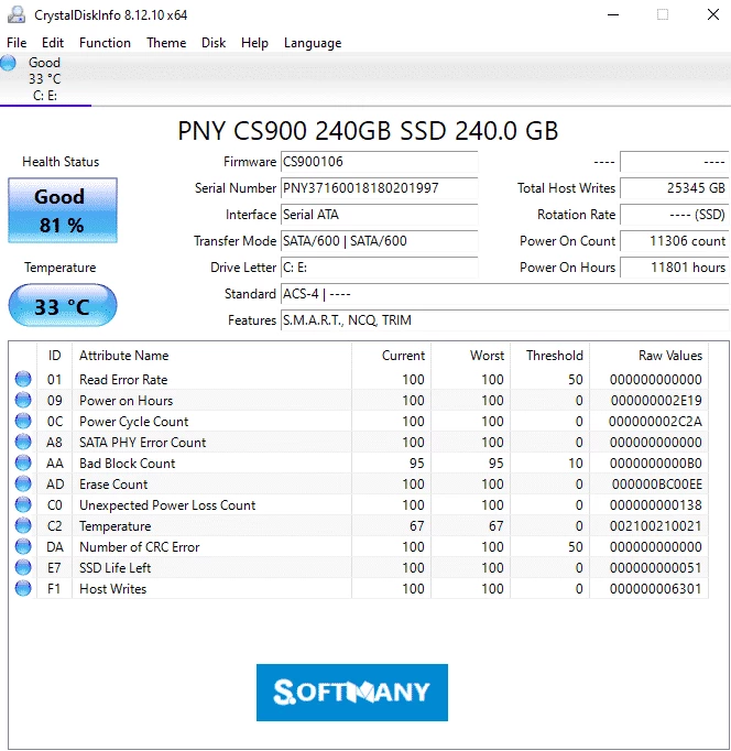 SMART(自我监控、分析和报告技术)是硬盘和固态硬盘 (SSD) 内置的功能。它使用户能够跟踪各种参数,例如温度、读写错误、通电时间等等。整个操作过程非常简单:所有连接到计算机的存储设备都会显示在此处,屏幕左侧还会显示 SSD 硬盘的总体健康状况及其预估百分比。如果任何硬盘出现故障,SMART 会发出警报,并允许您在硬盘发生故障之前备份数据。此外,您还可以查看设备的序列号、固件版本、接口、盘符等信息。